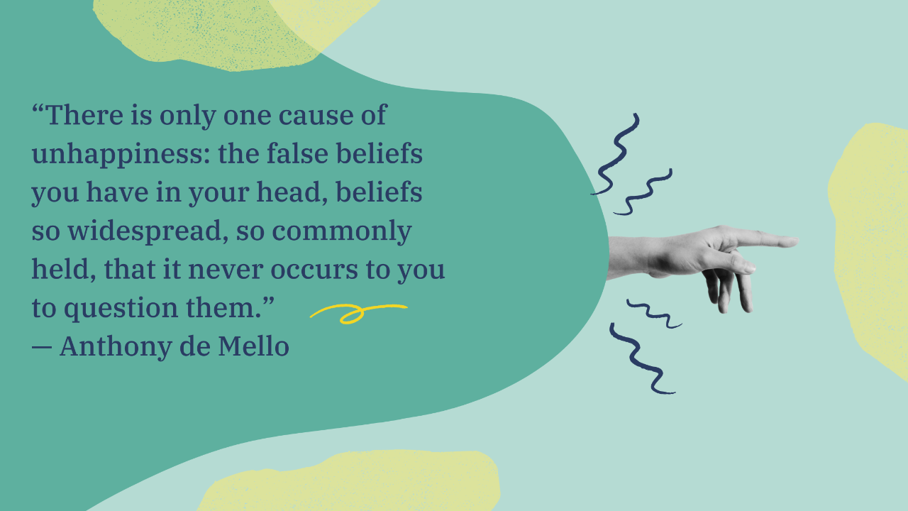 “There is only one cause of unhappiness: the false beliefs you have in your head—beliefs so widespread, so commonly held, that it never occurs to you to question them.” — Anthony de Mello